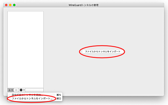 4.WireGuardにConfigファイルをインポートします。「ファイルからトンネルをインポート」より、ダウンロードしたConfigファイルを選択してください。