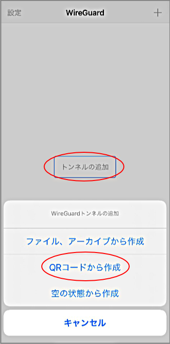 4.WireGuardにConfigファイルをインポートします。アプリを起動し、「トンネルの追加」から「QRコードの作成」をタップし、表示したQRコードを読み込ませます。