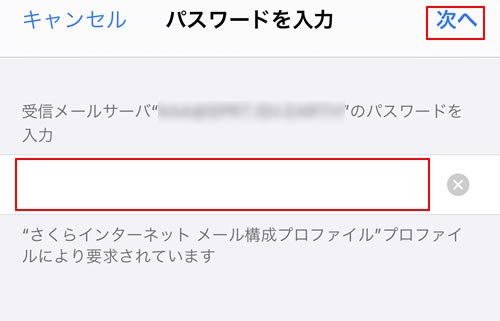 9.[パスワードを入力]と表示されますので、必須の空欄に『メールパスワード』を入力し、『次へ』をタップします。