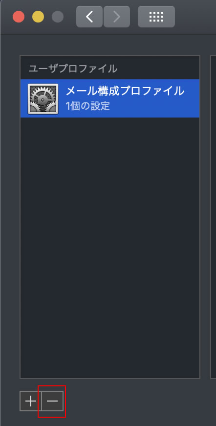 2.[プロファイル]のユーザ欄に表示される[メール構成プロファイル]を選択し、『-』をクリックします。