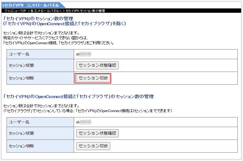 にログイン→「各コントロールパネルへ」→「セカイVPN」と進み「セッション切断ボタン」をクリックして、再接続してください。