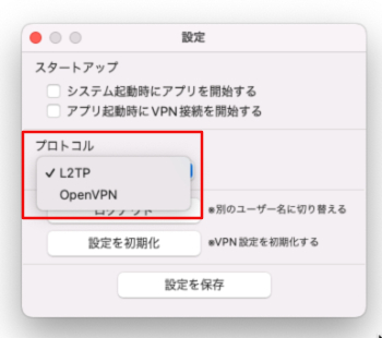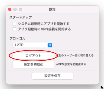 macOSのアップデート後などに、突然接続できなくなってしまった場合は、設定初期化ボタンをクリックして、再度ログインを行ってください。