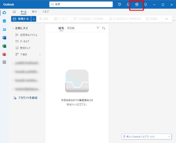 1.Outlook (new)を起動し、設定(歯車)のアイコンをクリックします。