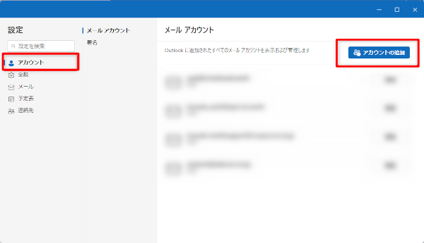 2.設定の「アカウント」をクリックし、「アカウントの追加」へ進みます。