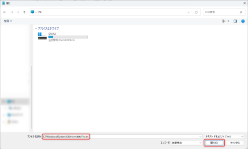 C:\Windows\System32\drivers\etc\hosts」と入力して「開く」をクリックし、hostsファイルを開きます。