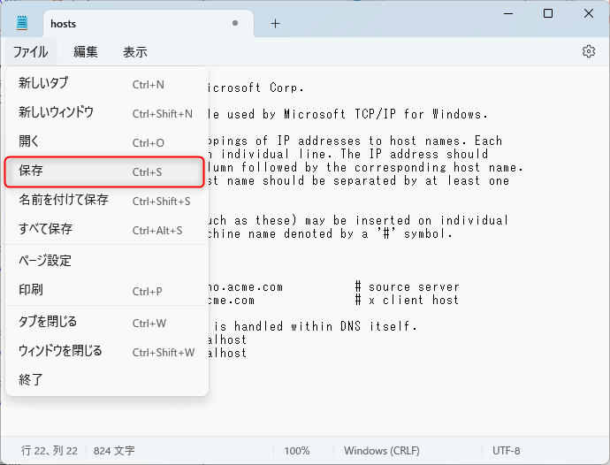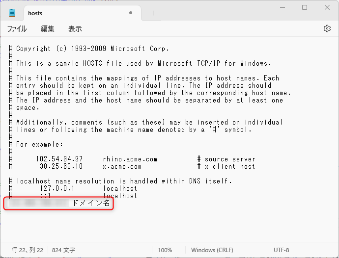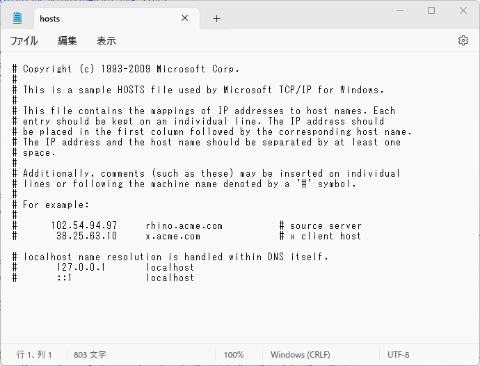 #を入力して、上書き保存後、hostsファイルは無効となります。