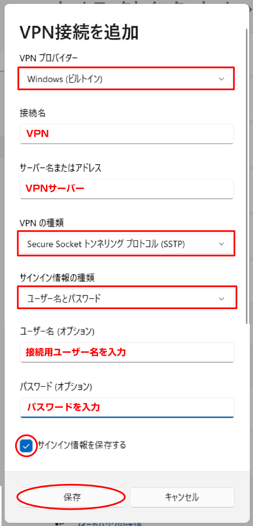 5.VPN接続を追加する画面になりますので、下記の通り入力し「保存」ボタンをクリックします。