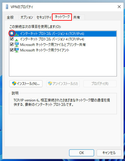 9.ネットワーク」のタブをクリックし、「インターネットプロトコルバージョン 6(TCP/IPv6)」のチェックを外します。