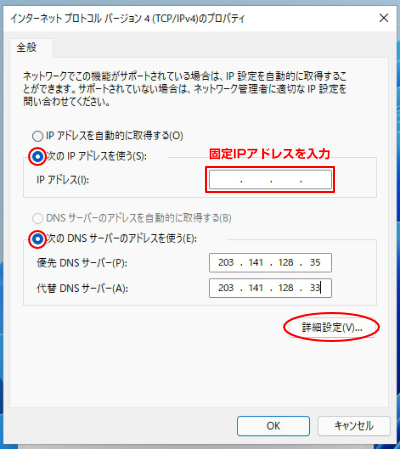 11.下記の画面が表示されます。IPアドレスとDNSサーバーは共に下記のように入力し、「詳細設定」をクリックします。