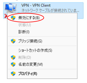 既にこちらで専用ソフト(PacketiX VPN Client)で接続設定を行っている場合は、VPN Client Adapter(仮想LANカード)を一旦無効にしてからVPN接続を行ってください。