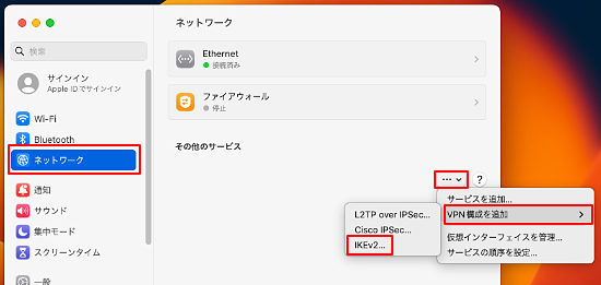 1.「システム環境設定」の「ネットワーク」より、下記画像の通り「IKEv2...」クリックします。