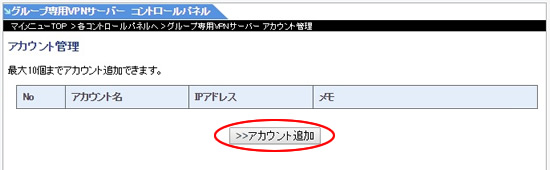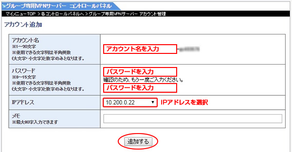 グループ専用VPNでVPN接続用アカウントを追加する場合は下記をご参照ください。