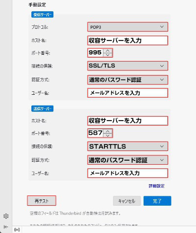 5.「次のアカウント設定が、指定されたサーバーを調べることによりみつかりました」と表示されたら「完了」をクリックします。