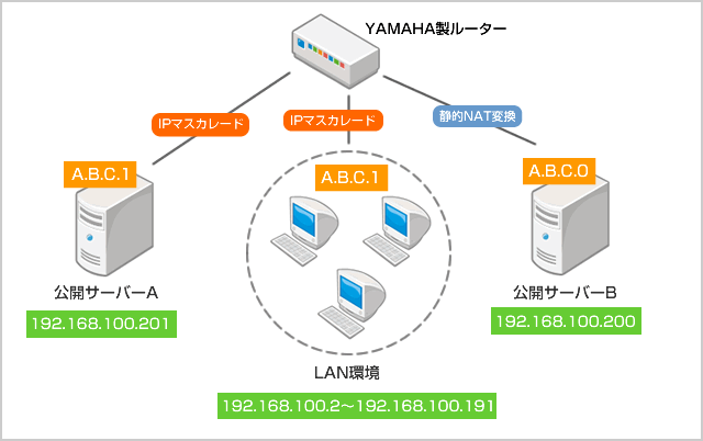 公開サーバーA: 192.168.100.201 (IPマスカレード)