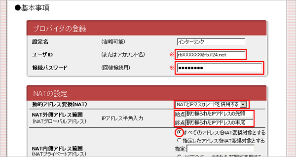 4.「プロバイダの登録」に接続用ユーザーIDとパスワード(設定名は任意で入力)、「NAT設定」は下記のように入力します。