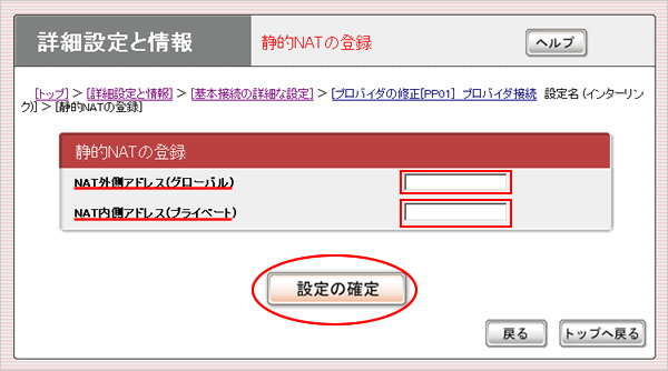 トップページの「プロバイダ情報の設定」から設定すると、NAT設定の画面が表示されません。 |