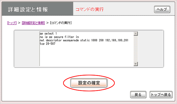 6.下記のようにコマンドを入力して、「設定の確認」をクリックします。
