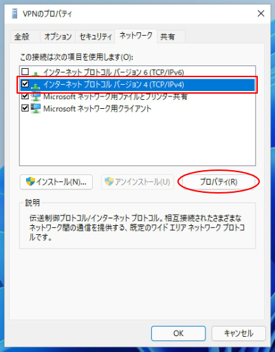10.「インターネット プロトコル バージョン4(TCP/IPv4 )を選択し、「プロパティ」ボタンをクリックします。