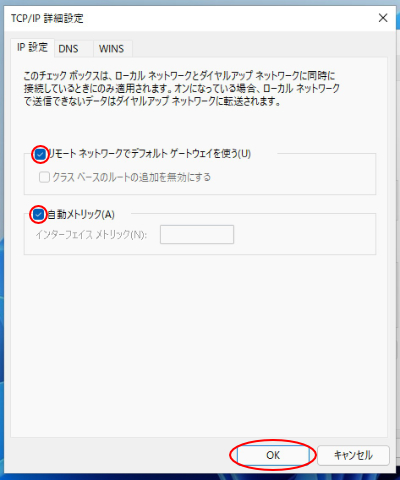 12.「リモートネットワークでデフォルトゲートウェイを使う」「自動メトリック」がそれぞれチェックONになっていることを確認します。確認したら「OK」ボタンをクリックしてください。