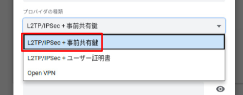 3.VPNネットワークへの接続画面になります。「プロバイダの種類」より「L2TP/IPsec + 事前共有鍵」を選択します。