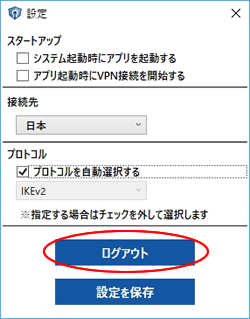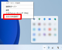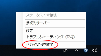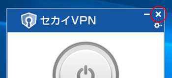 画面右上のボタンやタスクメニューより「セカイVPNを終了」をクリックします。