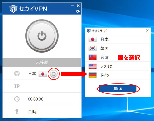 任意の接続先サーバーを選択して「閉じる」をクリックすると、接続先サーバーが切り替わります。