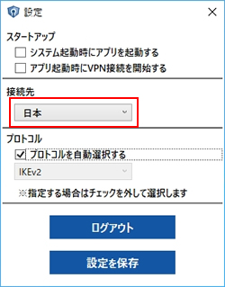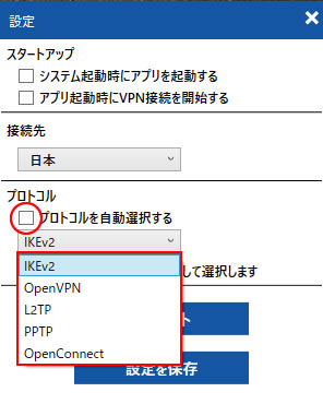 初期値は自動接続となっており、お客様のネットワーク環境で接続できるプロトコルを自動的に探して接続いたします。お客様側で通信方式を固定したい場合は、歯車マークから設定を開き、通信方式をご指定ください。