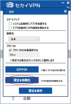 設定画面から「設定を初期化」ボタンをクリックすると現在のVPN設定を削除して再設定を行います。OSアップデート時などVPN接続に不具合が発生した際に初期化を実行してください。