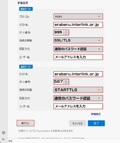 4.次の内容を入力して「再テスト」をクリックします。