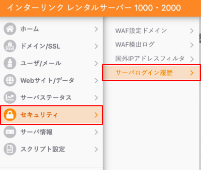 .セキュリティから『サーバログイン履歴』をクリックします。