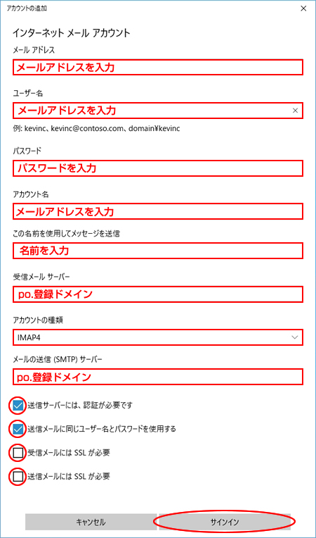 6.表示された項目を以下のように入力・選択して「サインイン」をクリックします。