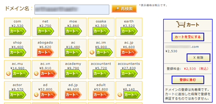 ご希望のドメインを選択をし、「カートへ」をクリックしてください。