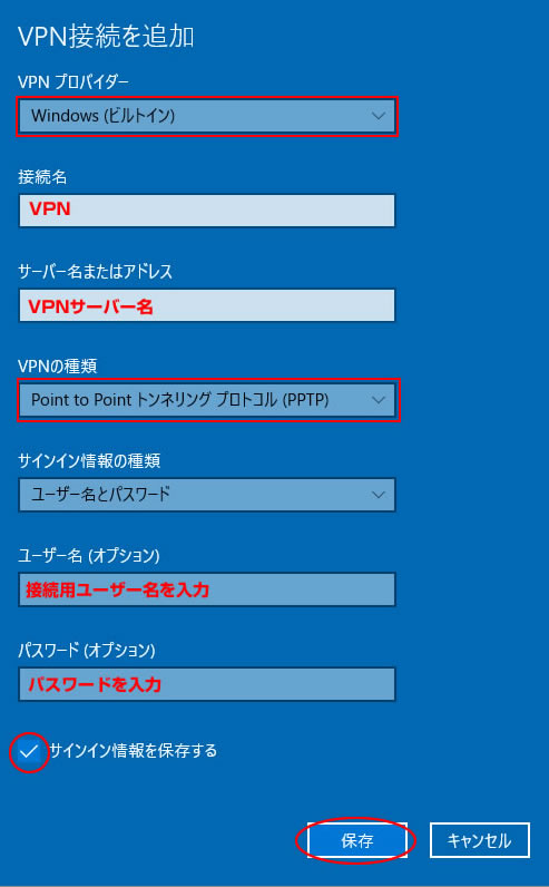 4. VPN接続を追加する画面になりますので、下記の通り入力し「保存」ボタンをクリックします。