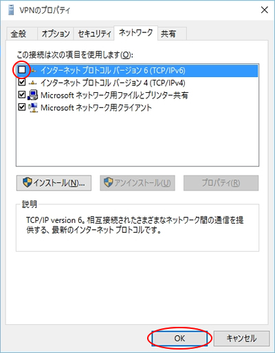 10. 「ネットワーク」のタブをクリックし、「インターネットプロトコルバージョン 6(TCP/IPv6)」のチェックを外して「OK」ボタンをクリックします。