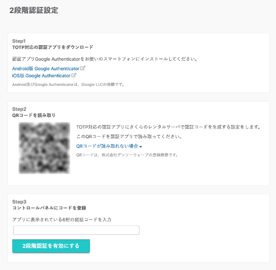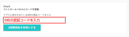 5.2段階認証設定の画面で、認証アプリに表示されている6桁の認証コードを表示時間内にサーバコントロールパネル上Step3のコード入力欄へ入力し、「2段階認証を有効にする」をクリックします。