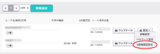 ・追加ユーザ/メールアドレスの2段階認証設定は各追加ユーザ/メールアドレスのサーバコントロールパネル上でしか設定できません。