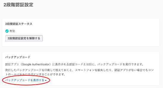 1.2段階認証有効後の設定画面で「バックアップコードを表示する」を開きます。