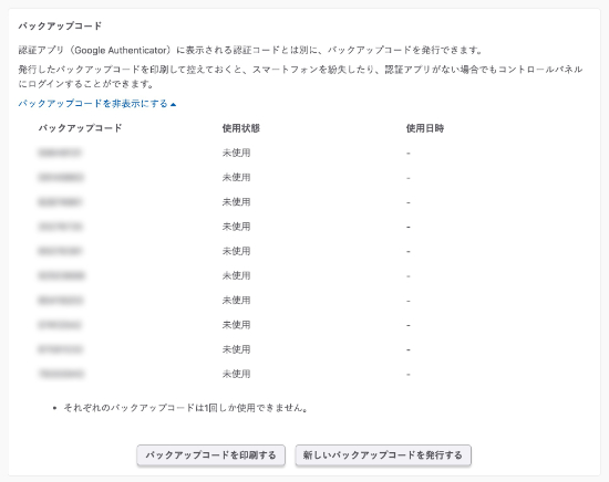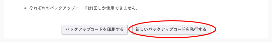 (新しいバックアップコードを発行すると、発行済みのバックアップコードは無効になります。)