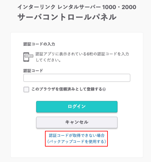 2.ログインが成功したら2段階認証の認証コードの入力画面で「認証コードが取得できない場合(バックアップコードを使用する)」をクリックします。