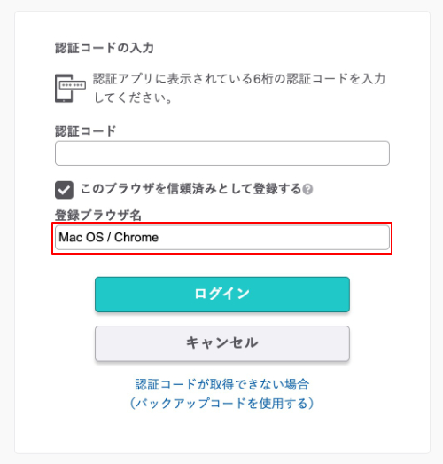※ バックアップコードでのログインは事前にバックアップコードの作成が必要です。
