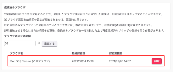 以降「認証期限日」までの間、登録したブラウザでの2段階認証がスキップされるようになります。