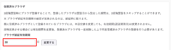 1.2段階認証設定の信頼済みブラウザ項目「ブラウザ認証有効期間」で任意の日数を入力し、変更をクリックします。