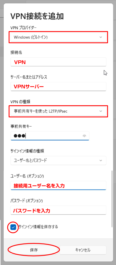 5.VPN接続を追加する画面になりますので、下記の通り入力し「保存」ボタンをクリックします。