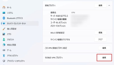 7.「その他のVPNプロパティ」の「編集」をクリックします。