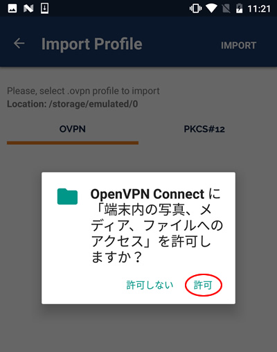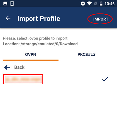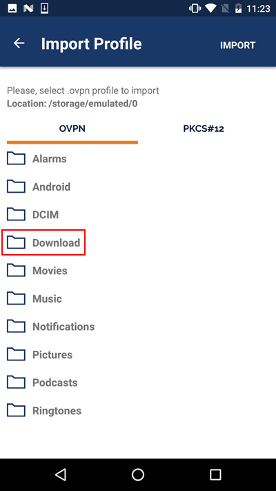 5.「Download」フォルダーをタップすると、ダウンロードした設定ファイル(ovpnファイル)が表示されますので、選択して「IMPORT」をタップします。