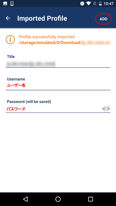 6.ユーザー名とパスワードを入力して「ADD」をタップします。