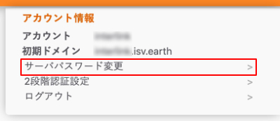 2.ページの右上「初期ドメイン(●●.isv.earth)」をクリックし『サーバパスワード変更』をクリックします。