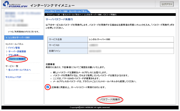 3.左メニューの「パスワード再発行」より、サーバーパスワードを再発行します。