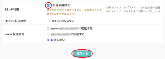 4.SSL利用の項目から『SSLを利用する』にチェックを入れて、「保存」をクリックします。
