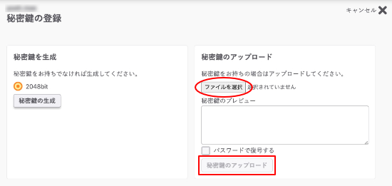 秘密鍵のアップロードから『参照』をクリックし、以前のサーバで利用されていた秘密鍵を選択して、『秘密鍵のアップロード』をクリックします。